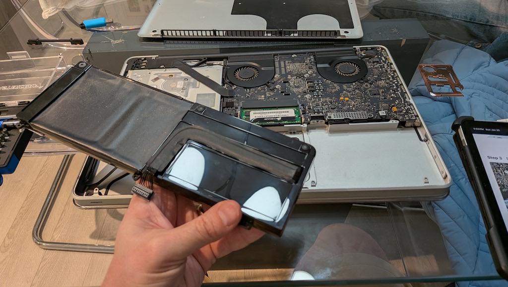 Now, with the battery out, I started removing every component and disconnecting all cables following the teardown tutorial. At the end, it was satisfying to see everything out.